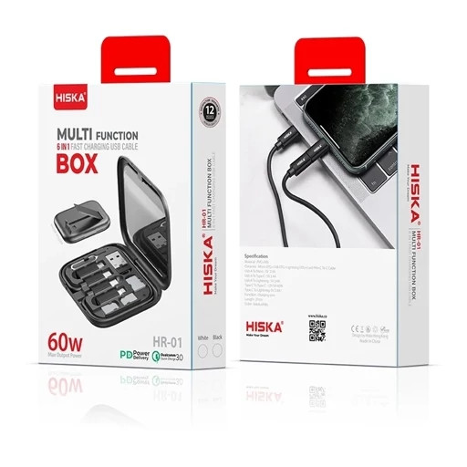 مجموعه لوازم جانبی هیسکا مدل Multi Function Box HR-01، یک پک کامل و جمعوجور برای سفرهای کاری و روزمره است که شامل کابلهای شارژ سریع، مبدلهای مختلف و ابزارهای ضروری مانند پین اجکتور سیمکارت و پایه نگهدارنده موبایل میباشد.